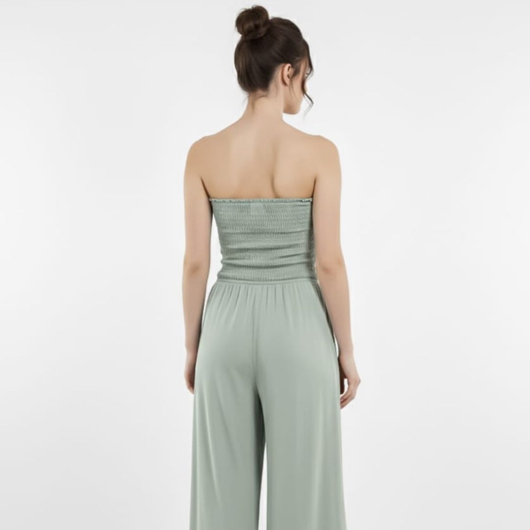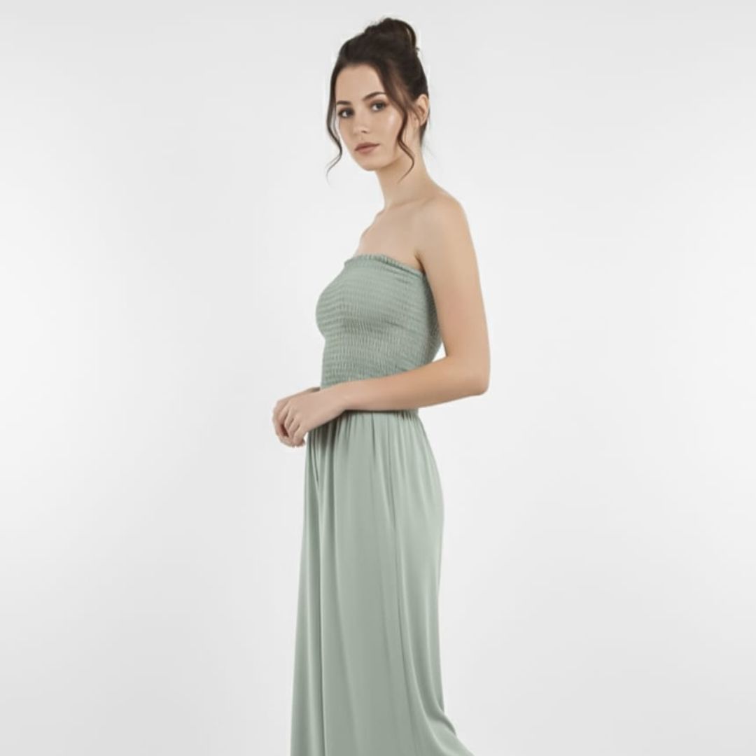The image shows a woman seated in a white chair, wearing a strapless sage green maxi dress with a smocked bodice and flowing skirt. She pairs it with neutral heels, styled with loose waves, exuding a calm and sophisticated vibe.